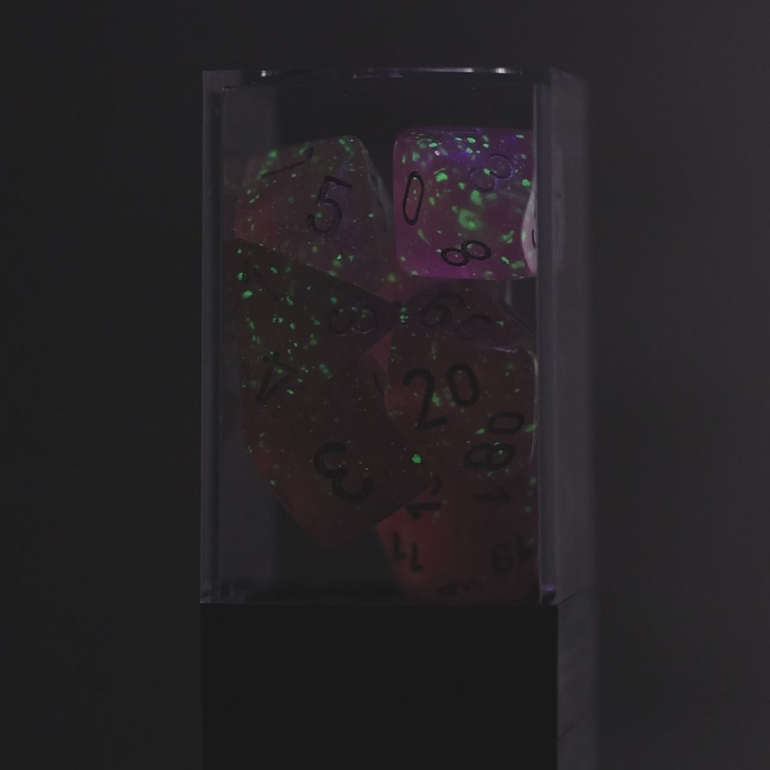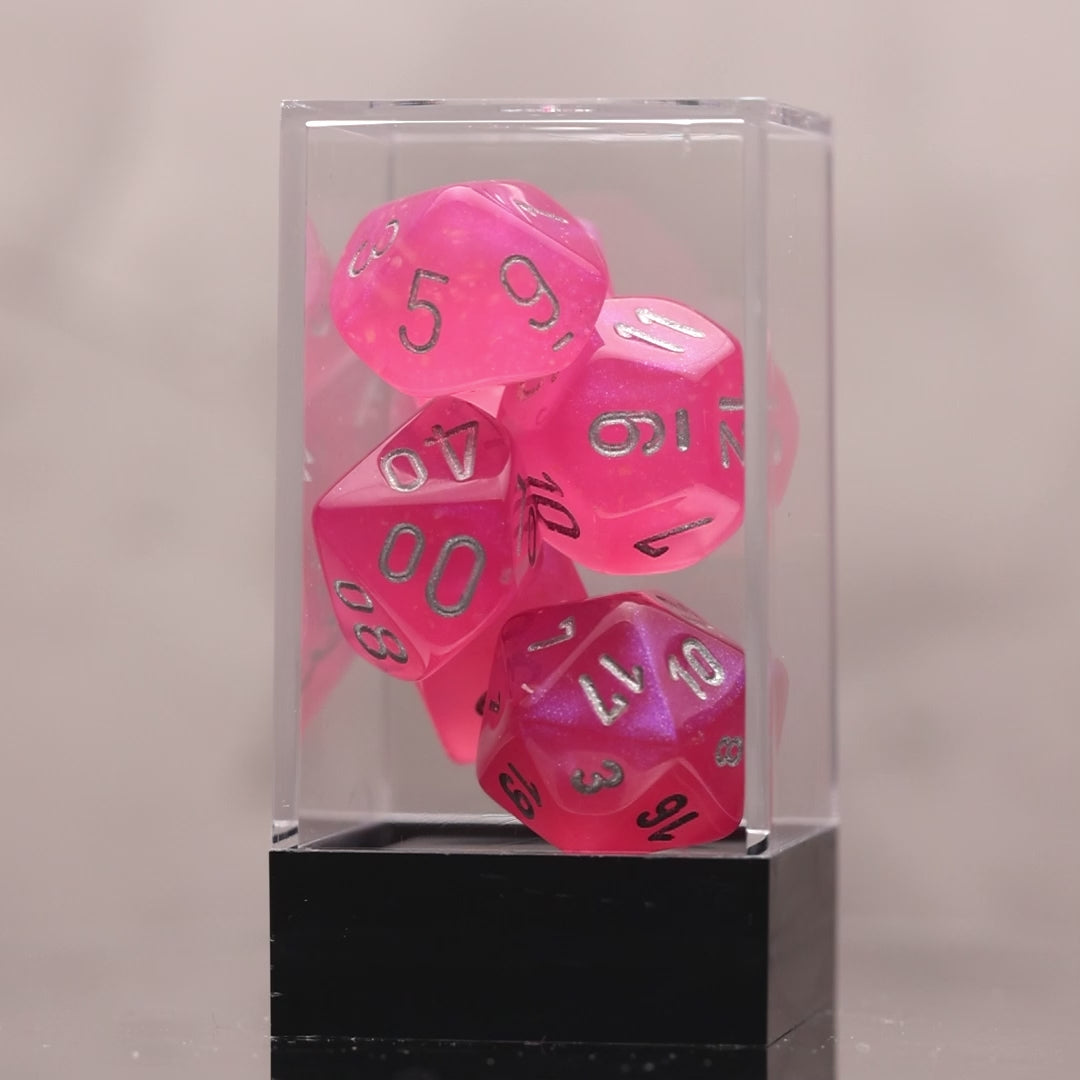 The Chessex Borealis Pink/Silver Polyhedral 7-Die Set (CHX 27584) features a vibrant pink hue with a dazzling Borealis shimmer and silver-inked numerals for clear readability. This set includes d4, d6, d8, d10, d%, d12, and d20, perfect for D&D, Pathfinder, and other RPGs. A must-have for dice collectors and tabletop gamers alike!