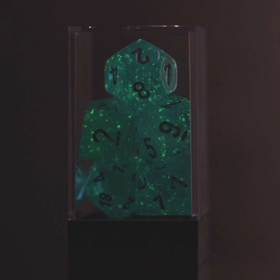 The Chessex Luminary Sky/Silver Polyhedral 7-Die Set (CHX 27566) features a soft sky blue hue with a subtle luminary glow-in-the-dark effect and sleek silver numerals for easy readability. This set includes d4, d6, d8, d10, d%, d12, and d20, making it perfect for D&D, Pathfinder, and other RPGs. A glowing and celestial addition to any dice collection!