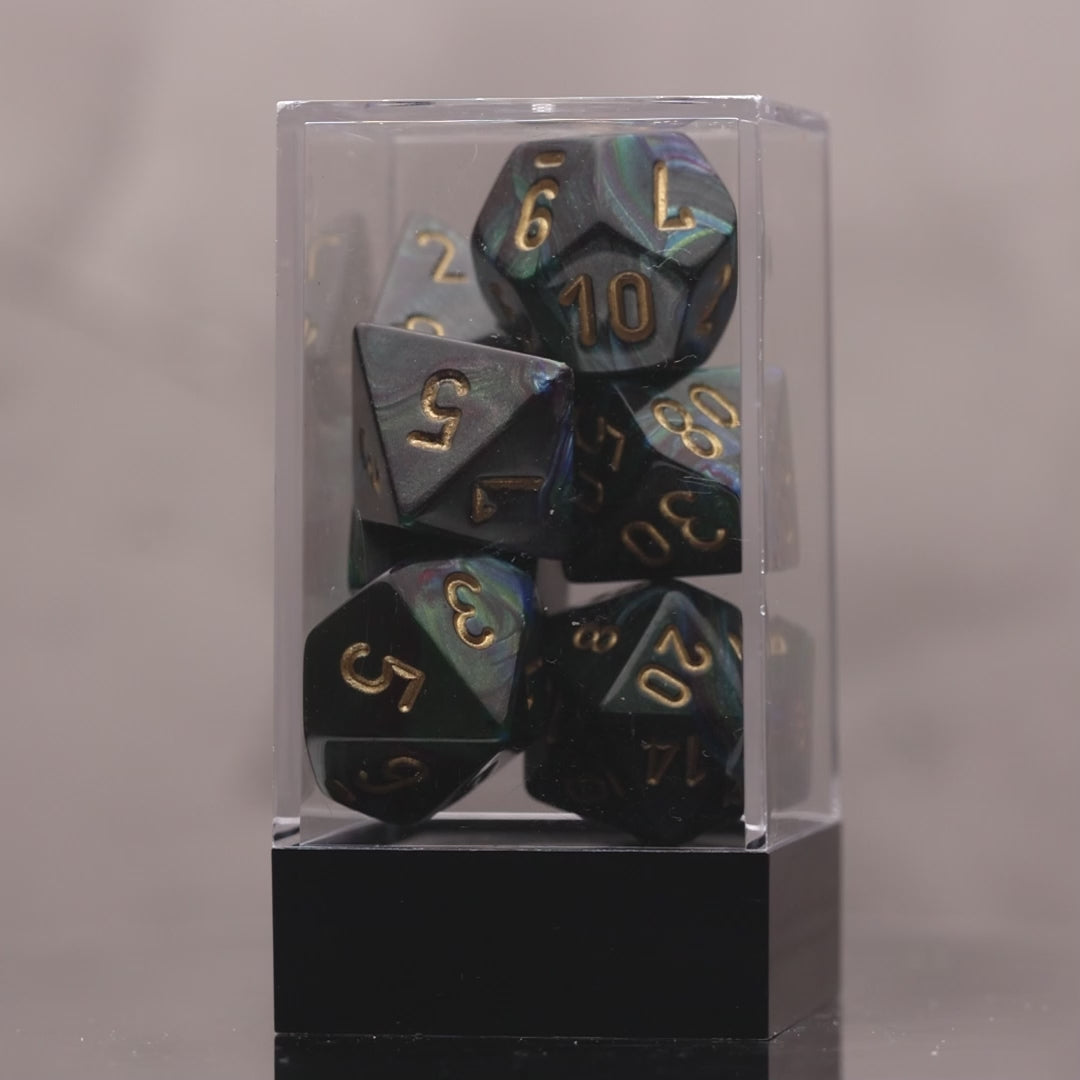The Chessex Lustrous Shadow/Gold Polyhedral 7-Die Set (CHX 27499) features a deep, dark shadow hue with a luxurious gold shimmer and gold-inked numerals for easy readability. This set includes d4, d6, d8, d10, d%, d12, and d20, perfect for D&D, Pathfinder, and other RPGs. A sleek and elegant addition to any dice collection!